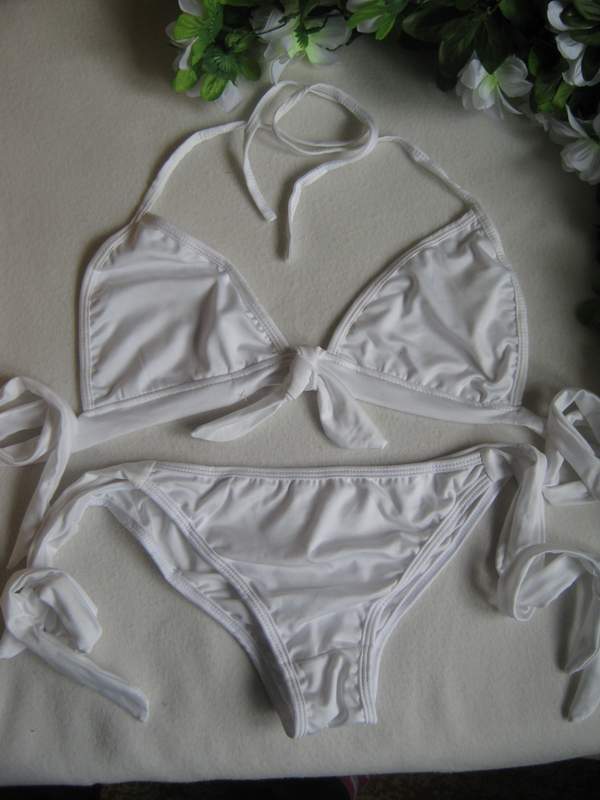Раздельный купальник белого цвета. Лиф и трусики на завязках. Чашечки без поролоновых вставок, трусики со сборкой.