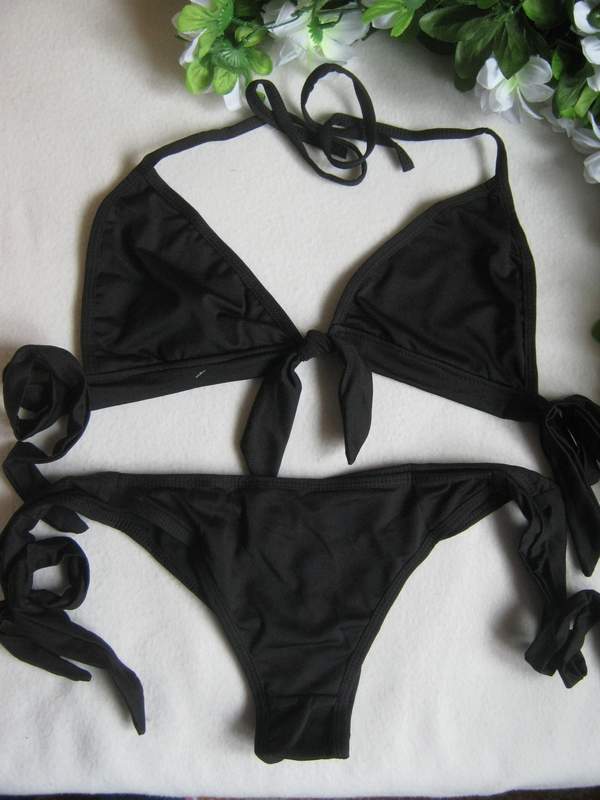 Раздельный купальник черного цвета. Лиф и трусики на завязках. Чашечки без поролоновых вставок, трусики со сборкой.