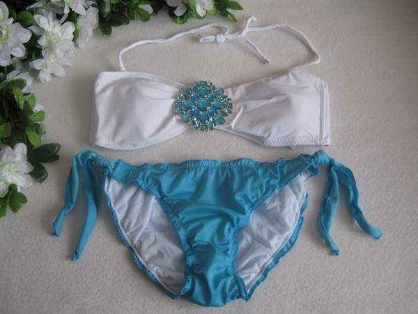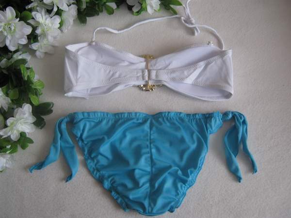 Бело-голубой раздельным купальник. Плавки декорированы рюшами по краю и вертикальной сборкой сзади, сбоку на завязках. Топ белого цвета украшен брошью. Топ с поролоновыми чашечками сзади на застежке, дополнен съемной бретелью через шею.
