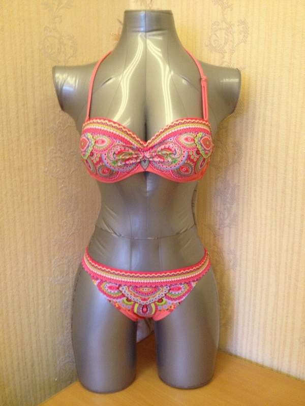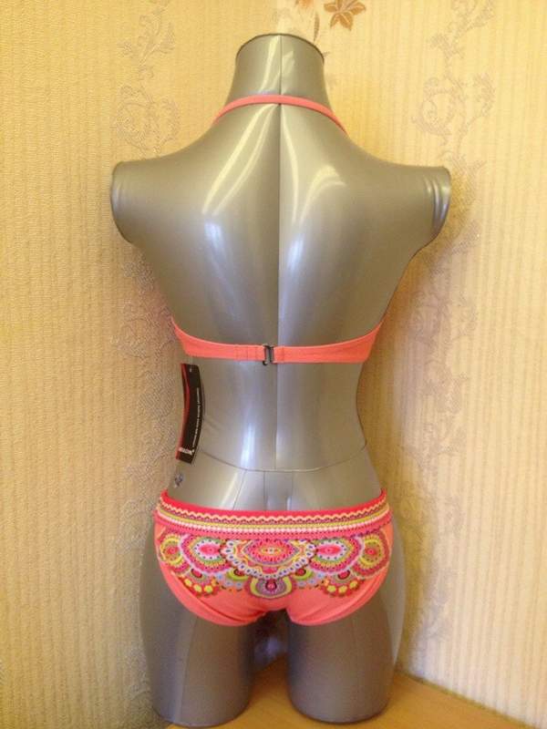 Купальник персикового цвета с ярким летним рисуноком зрительно увеличивает грудь за счет эффекта пуш-ап. В комплекте дополнительная съемная лямочка через шею. Трусики классические.