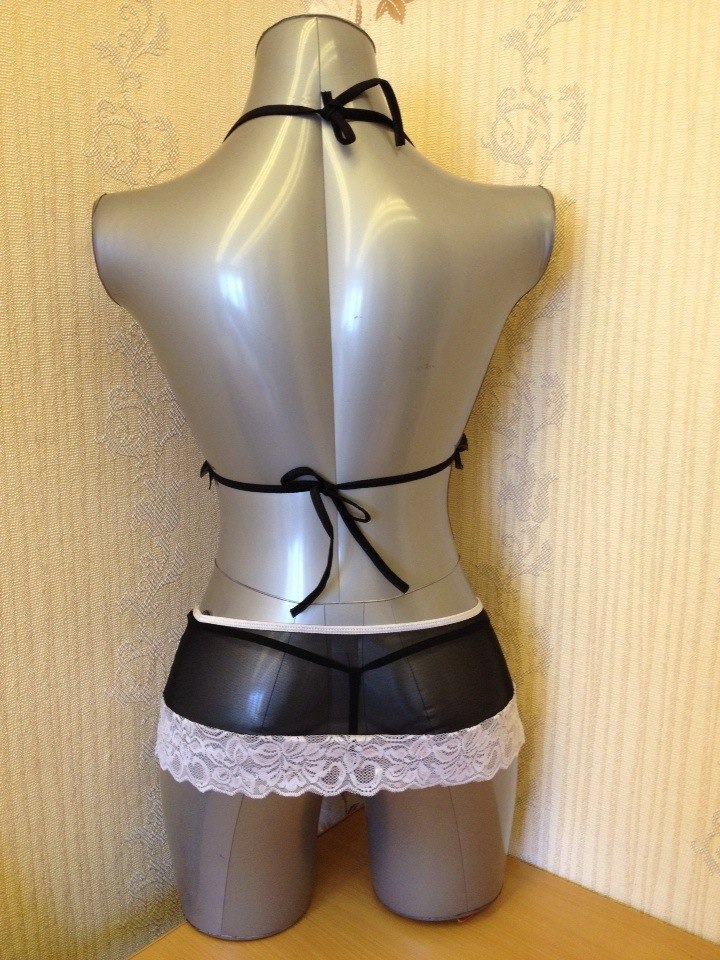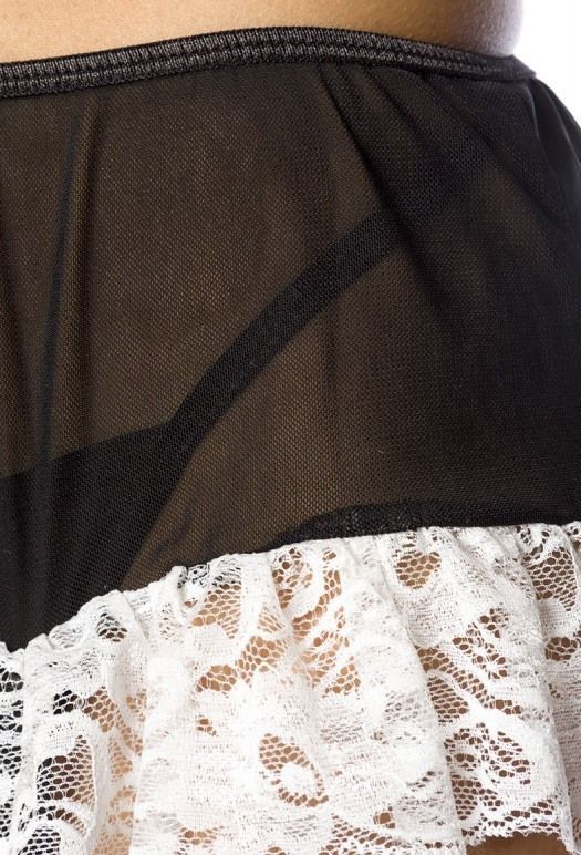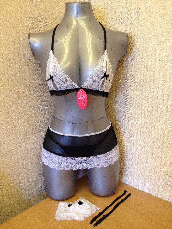 Соблазнительный комплект горничной, состоящий из лифа, юбочки, подтяжек и нарукавников. Выполнен из мягкого кружева и сеточки, которые практически ничего не скрывают от взора возлюбленного.