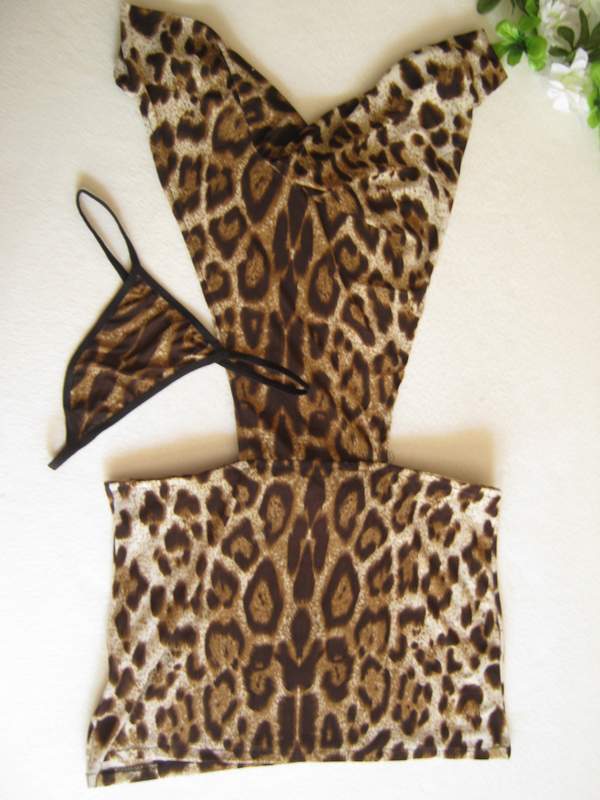 Открытое мини-платье цвета шкуры леопарда с цепочкой на спине.