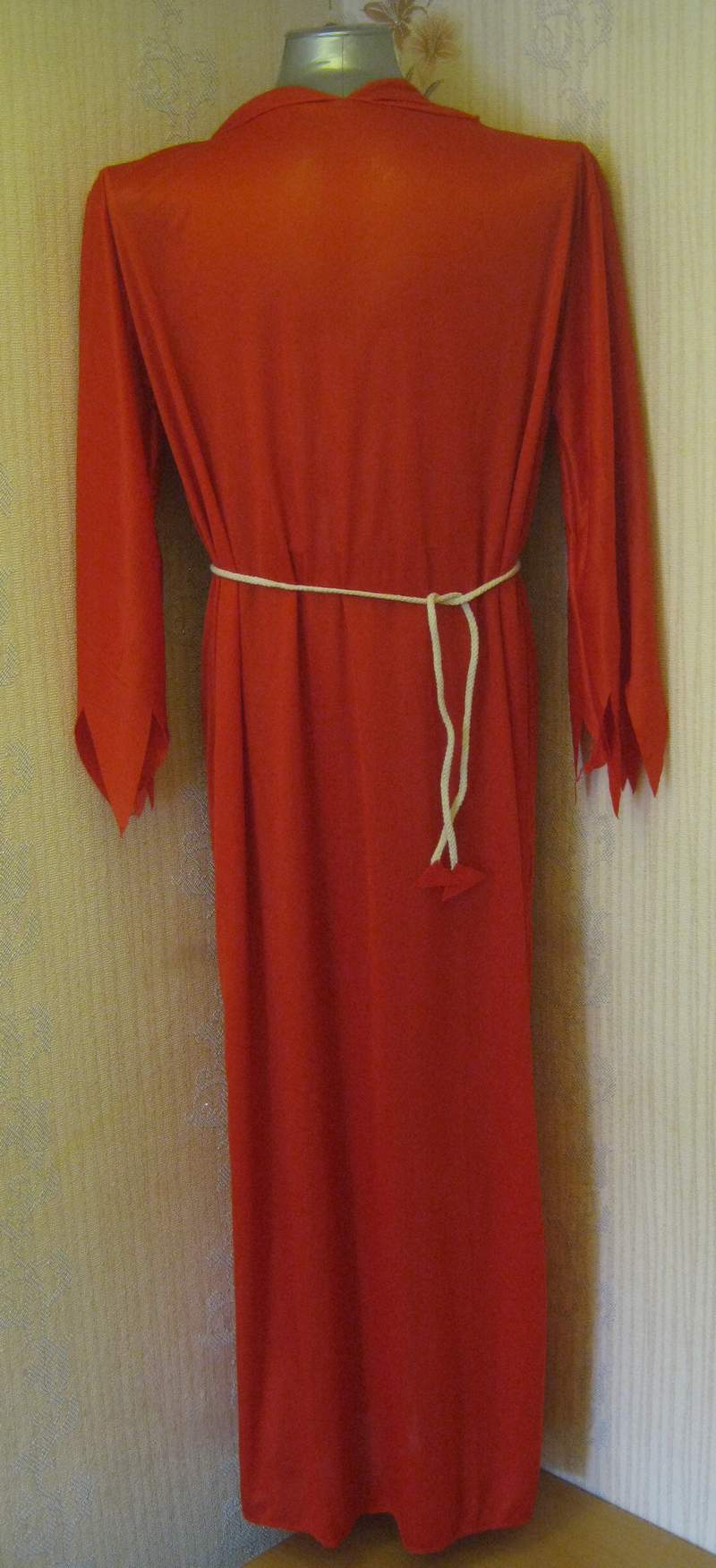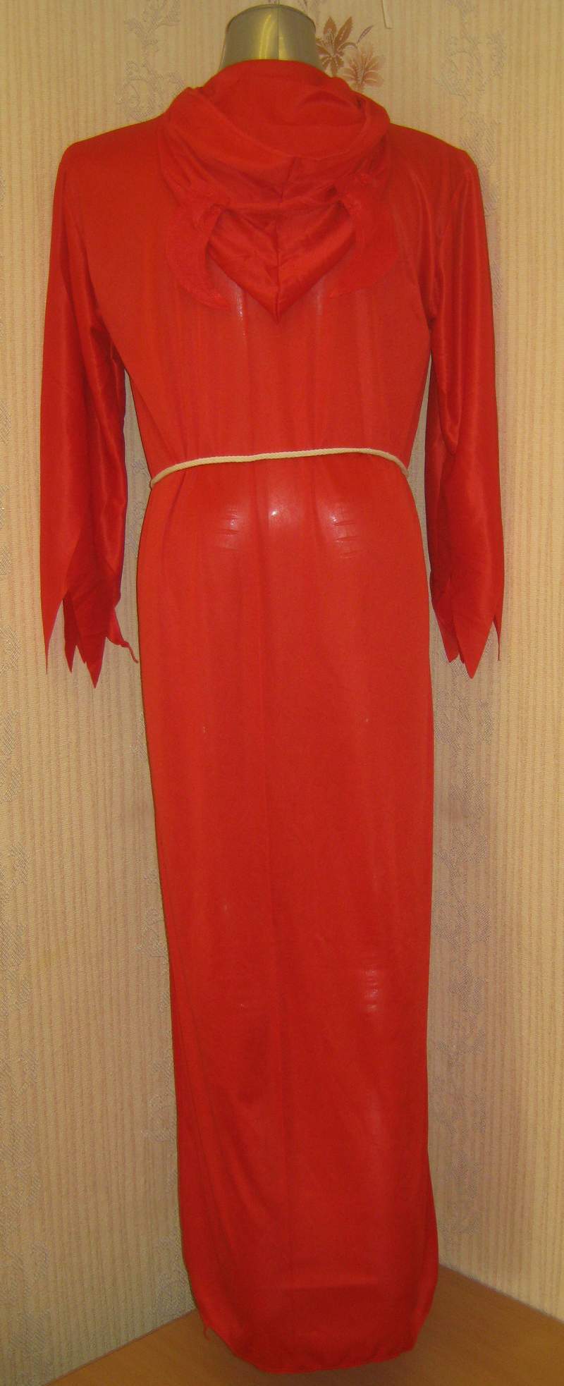 Мужской костюм дьявола включает: красный длинный балахон с капюшоном и рогами, пояс.