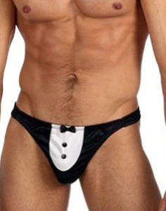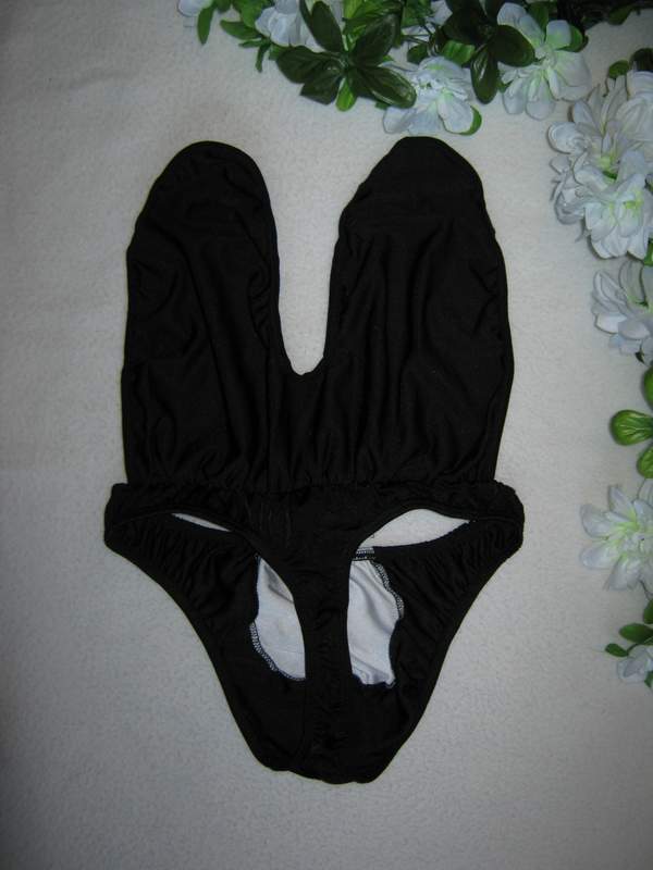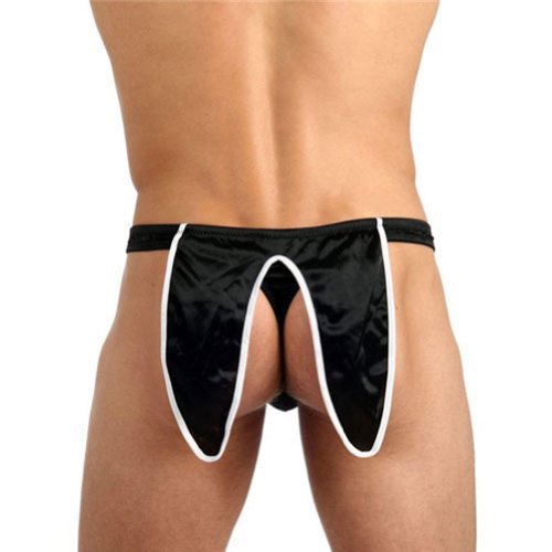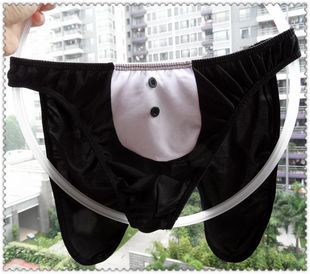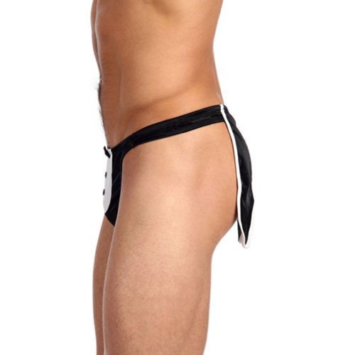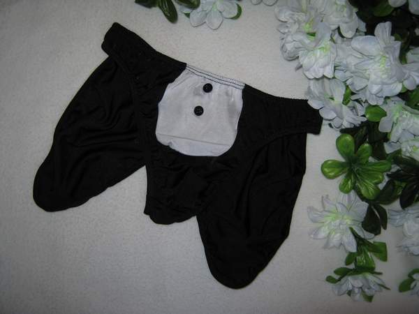 Черные трусы-стринги выполнены из эластичной ткани и украшены спереди белой вставкой и пуговицами. Растягивается в диапазоне 70-90 см. Выпускаются в одном размере S-M.