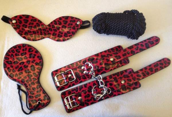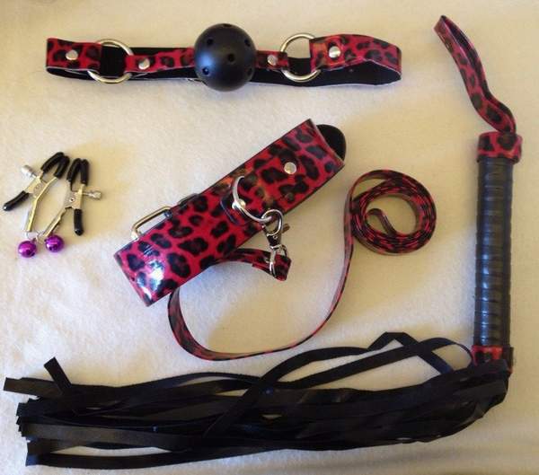 Комплектация: наручники, маска, хлопалка, веревка, кляп, плетка, ошейник с поводком, подвески на соски