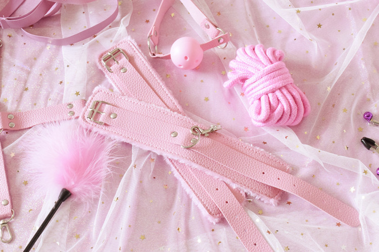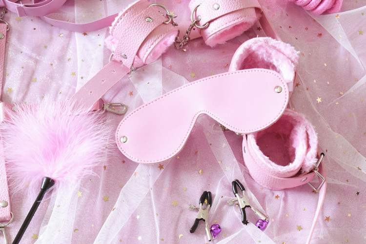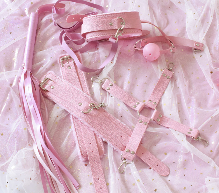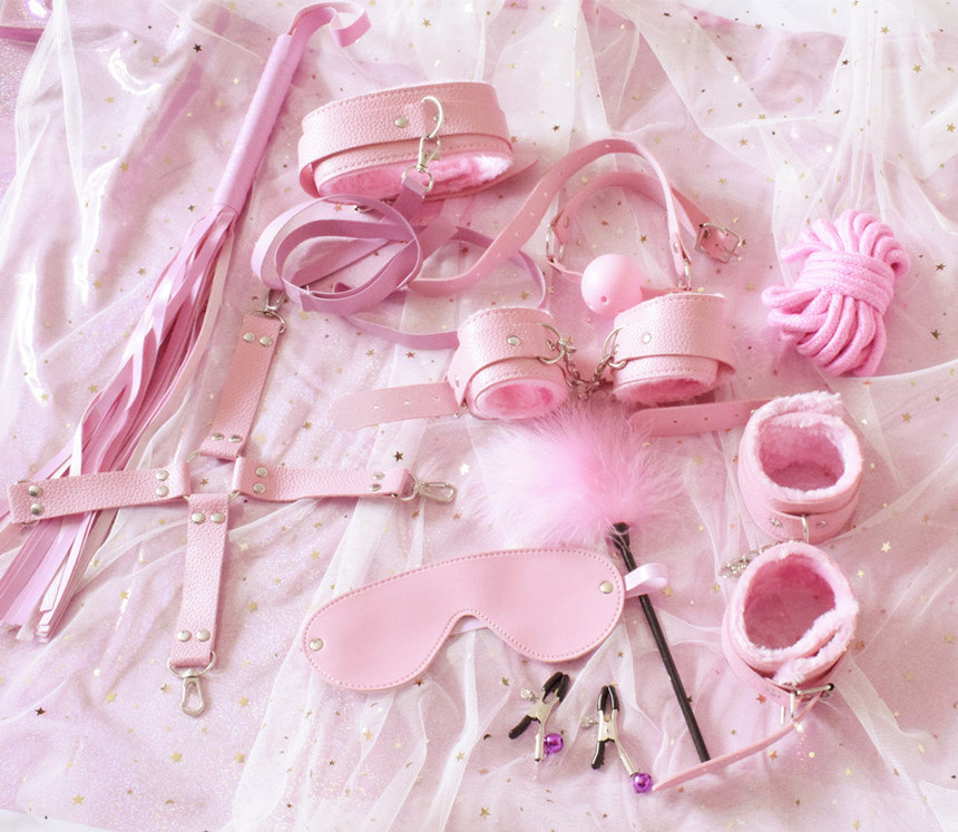 Комплектация: наручники, оковы, крестовина для оков и наручников, ошейник с поводком, кляп, маска, плетка, веревка, зажимы на соски, палочка с перышком