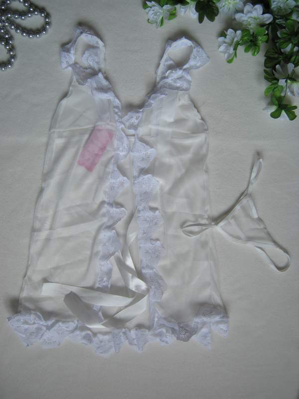 Романтичная белая сорочка-пеньюар, украшенная зубчатым кружевом. Трусики-стринги в комплекте