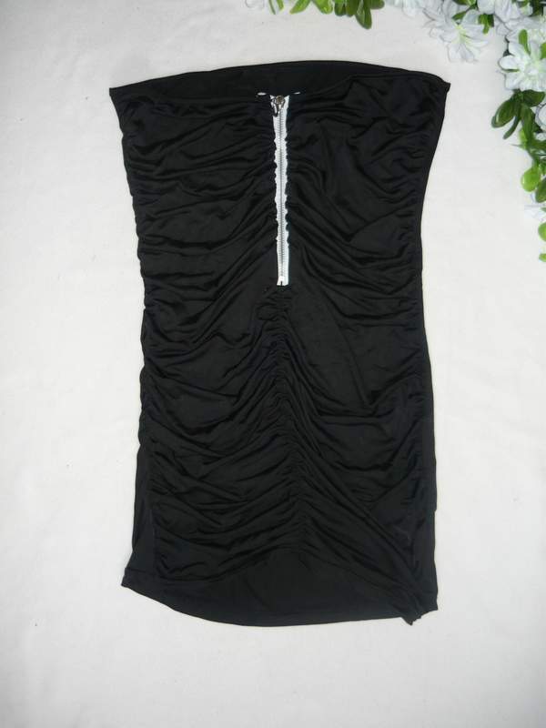 Платье сексуально обнажает плечики, а черный цвет придает строгости. Сзади на спинке контрастная белая молния.