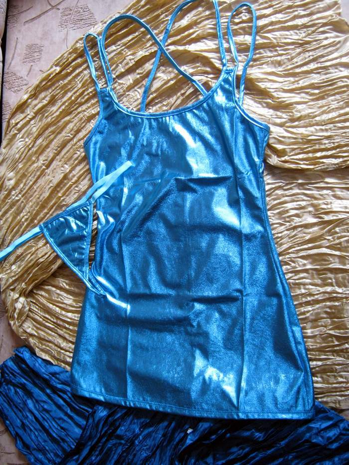 Короткое платье из спандекса с виниловым напылением. Длина платья 68 см. Трусики-стринги в комплекте
