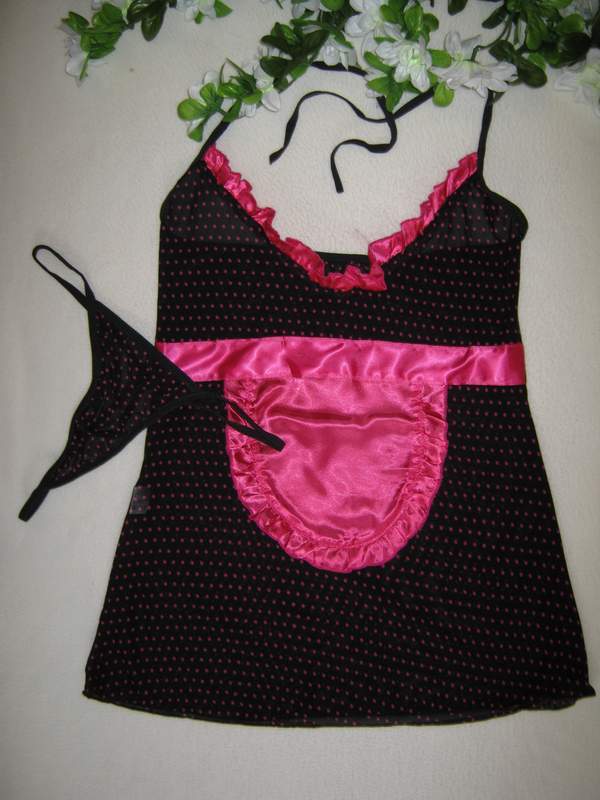 Эластичная сорочка в горошек украшена атласными лентами и атласным фартучком, завязывается на шее.