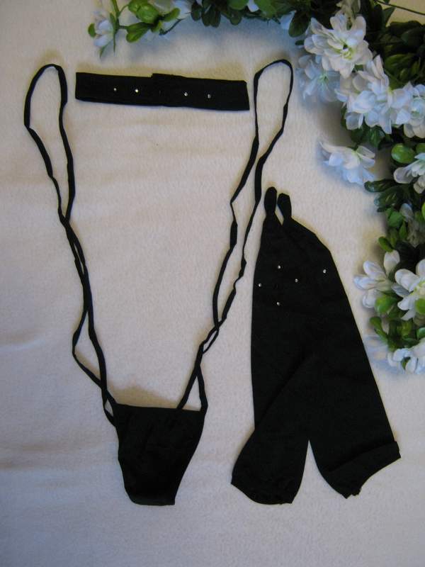 Откровенный комплект выполнен из эластичного материала и украшен стразами. В комплекте боди, повязка, перчатки.