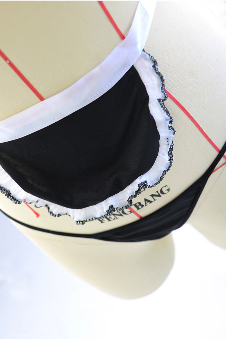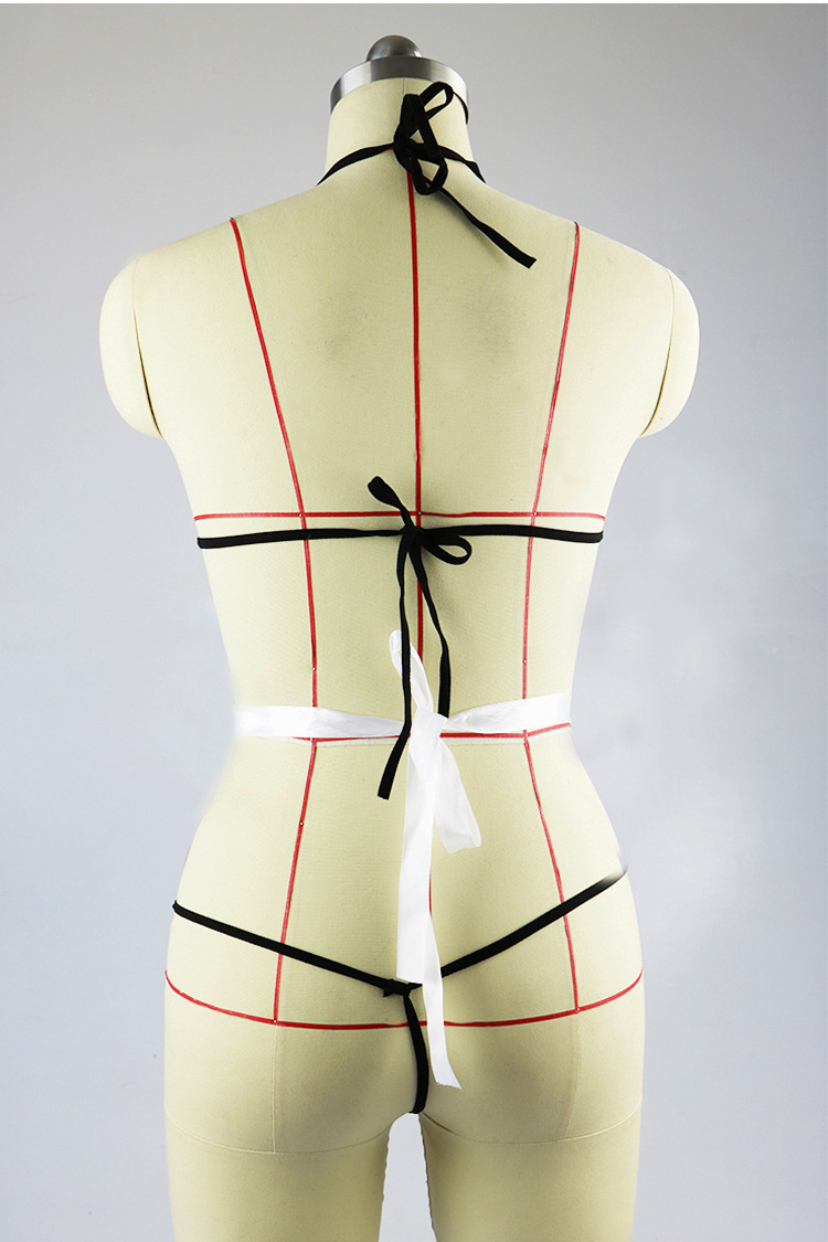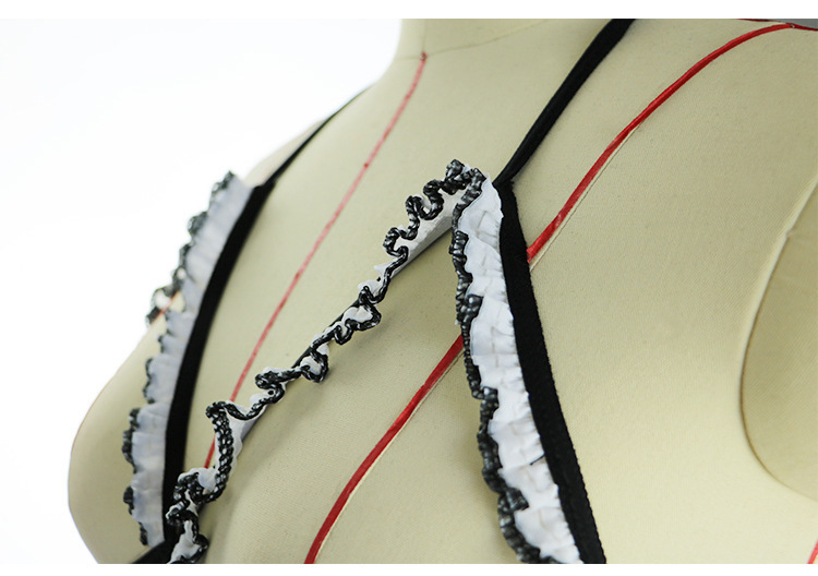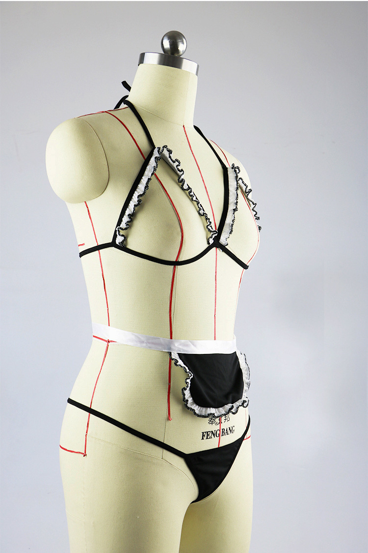 Соблазнительный откровенный игровой костюм горничной состоит из лифа, оставляющего грудь открытой, трусиков и очаровательного маленького фартучка. Лиф завязывается на спине и шее, фартучек завязывается атласными лентами.