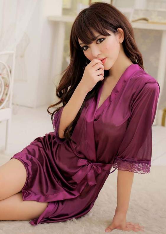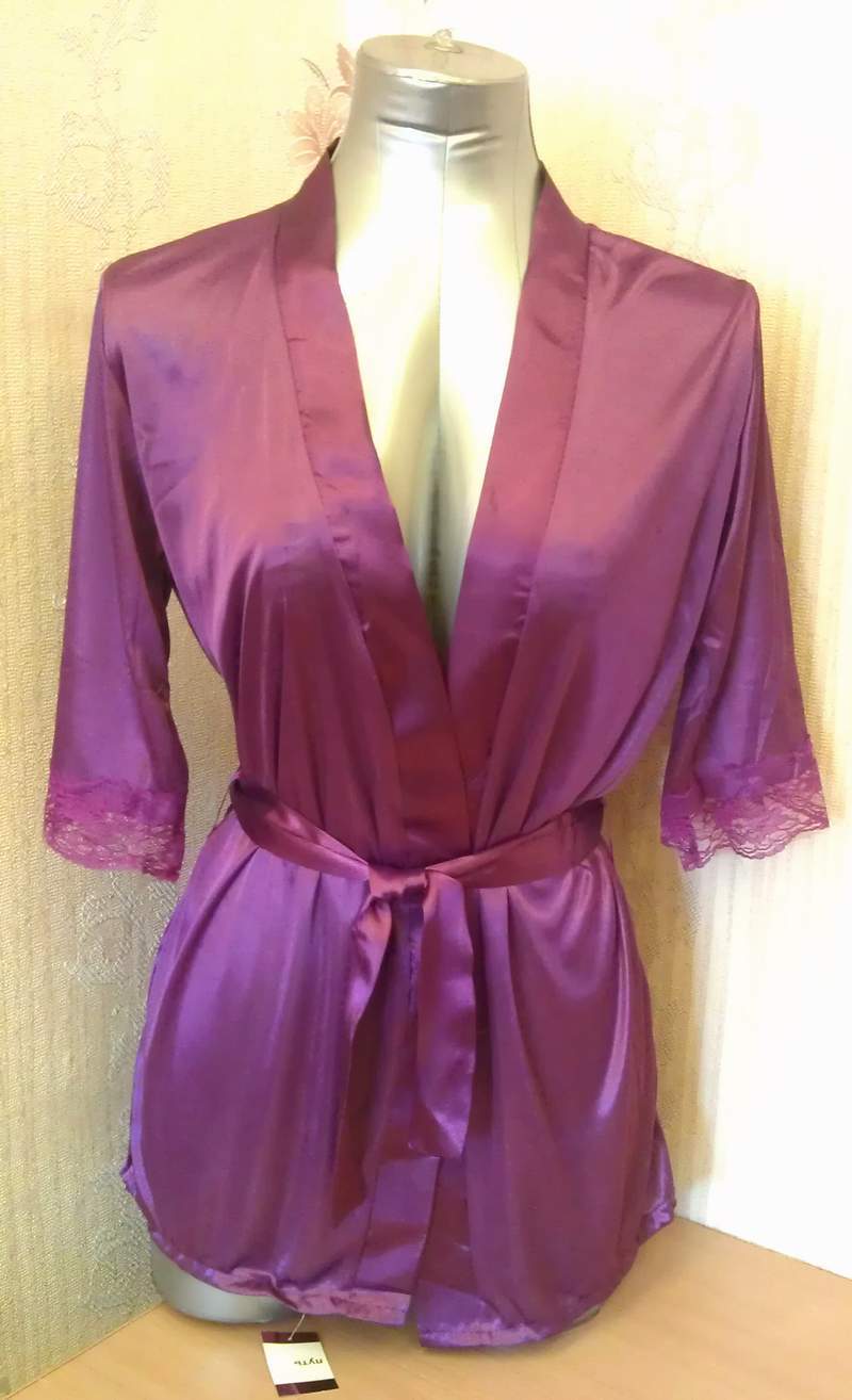 Атласный пеньюар с укороченными рукавами, декорированными кружевом в тон пеньюара.
