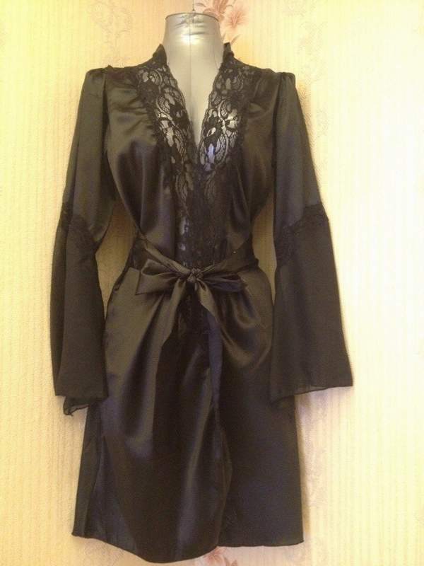 Струящийся черный пеньюар подчеркнет Вашу красоту и изящность вашей фигуры. В нем Вы будете ослепительны.