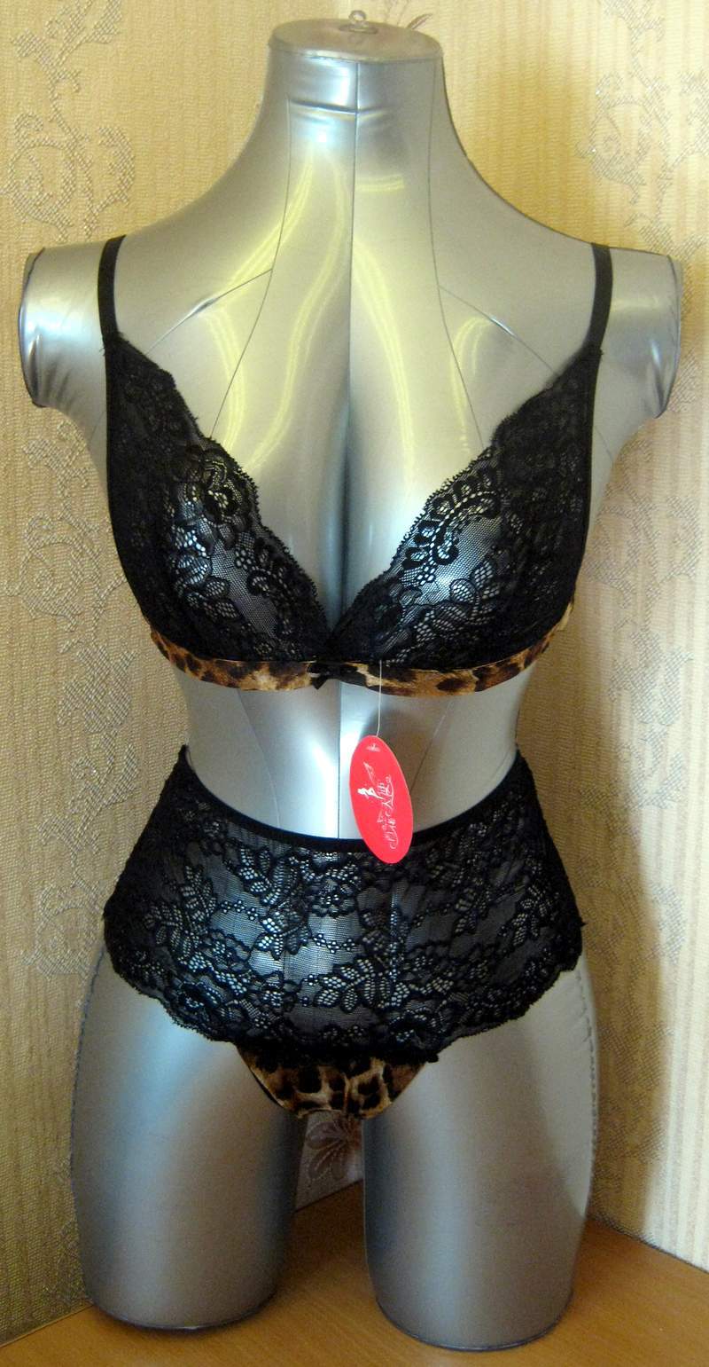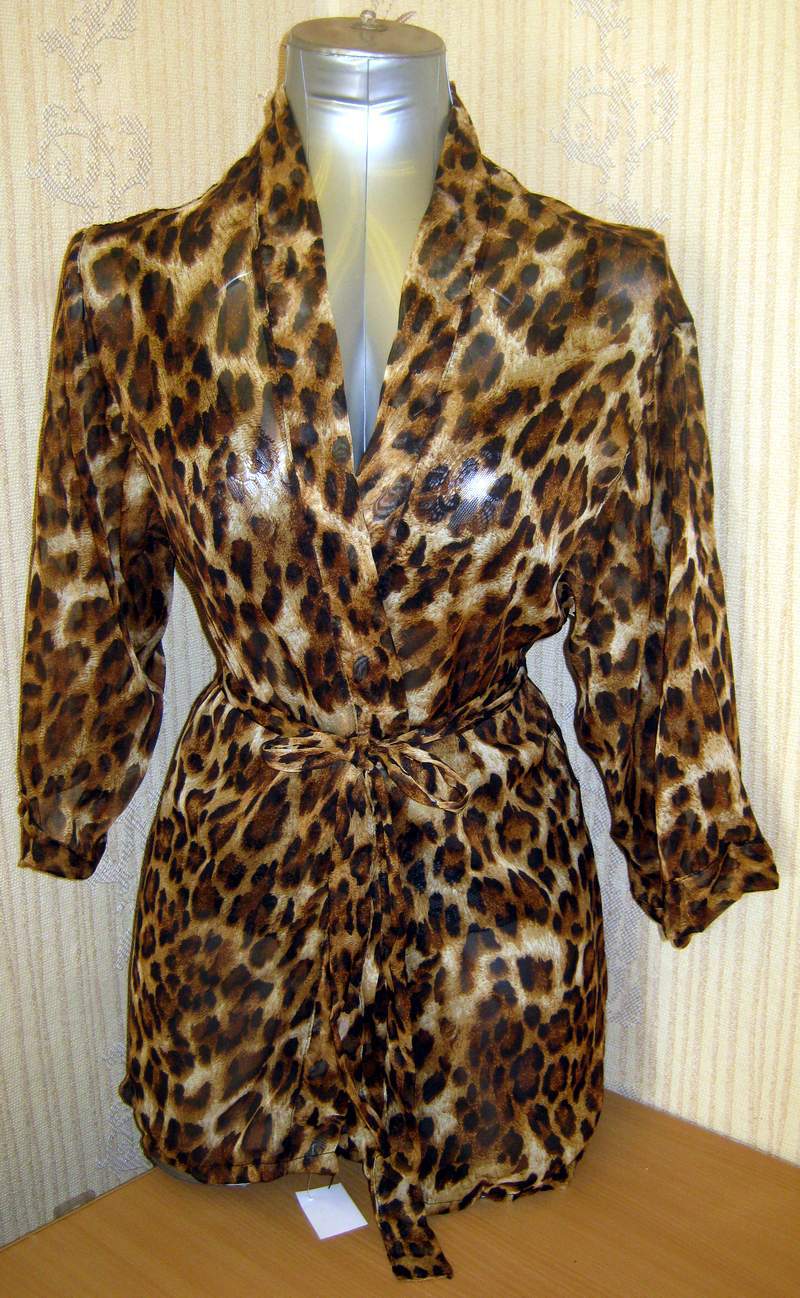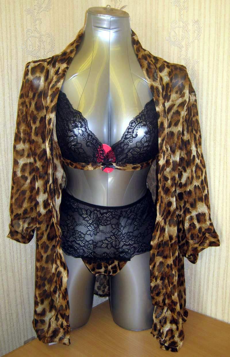 В комплекте пеньюар леопардовой расцветки, кружевной лиф и высокие трусики.