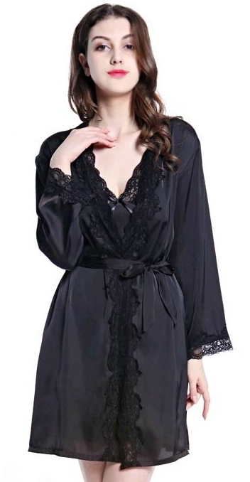 Черный атласный пеньюар с отделкой из кружева. Обхват у всех размеров одинаков. Чем больше Ваш размер, тем меньше запах пеньюара.