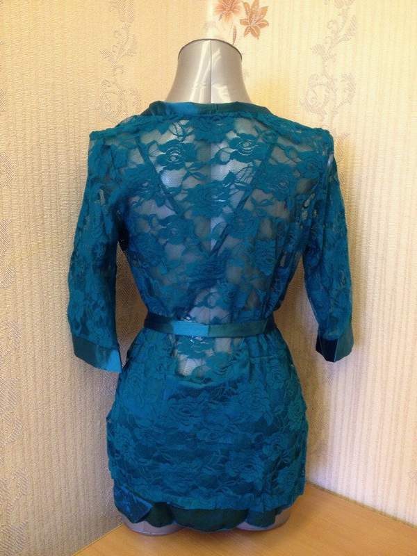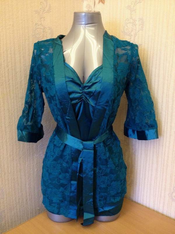 В комплекте однотонная изумрудная сорочка и кружевной пеньюар.