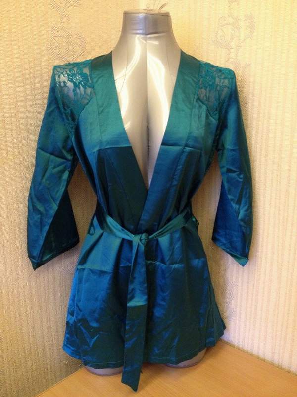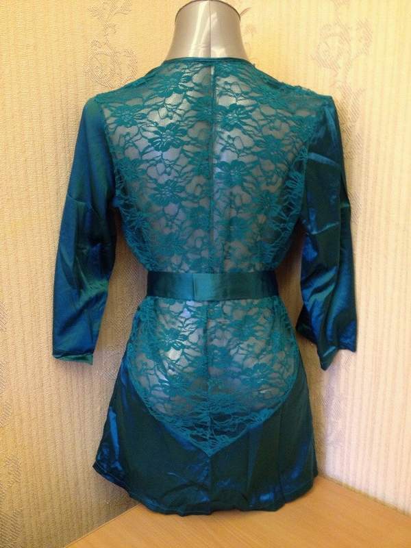 Атласный пеньюар с укороченным рукавом и кружевной спинкой.