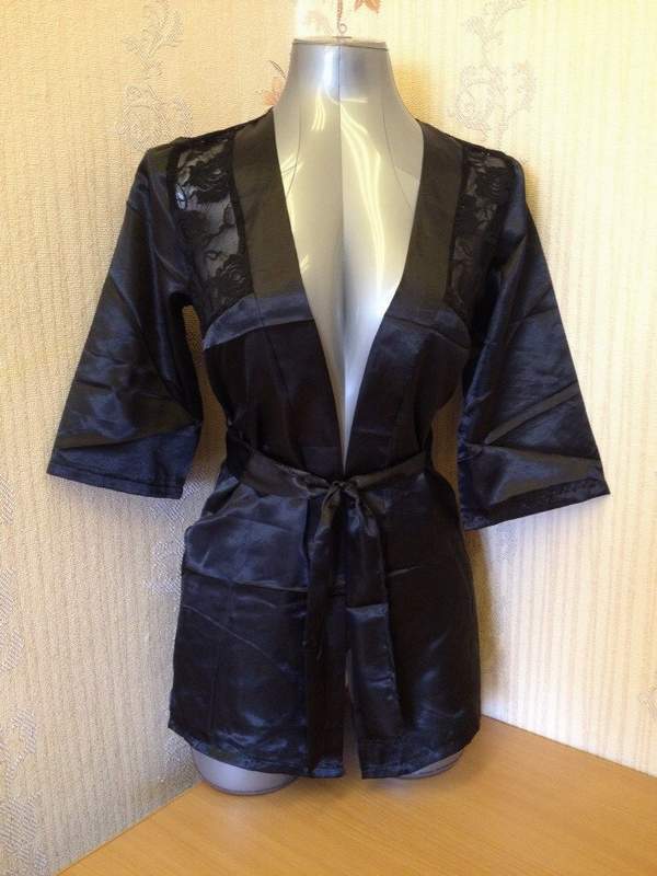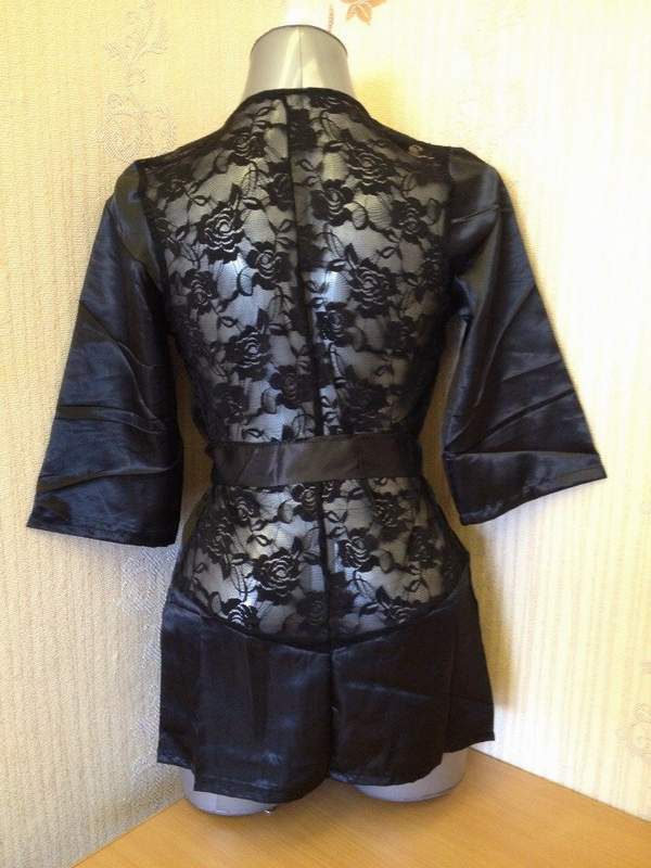 Атласный пеньюар с укороченным рукавом и кружевной спинкой.