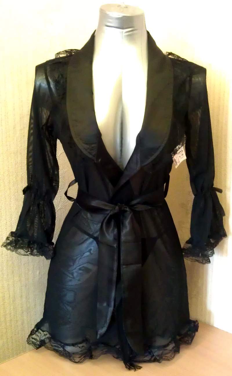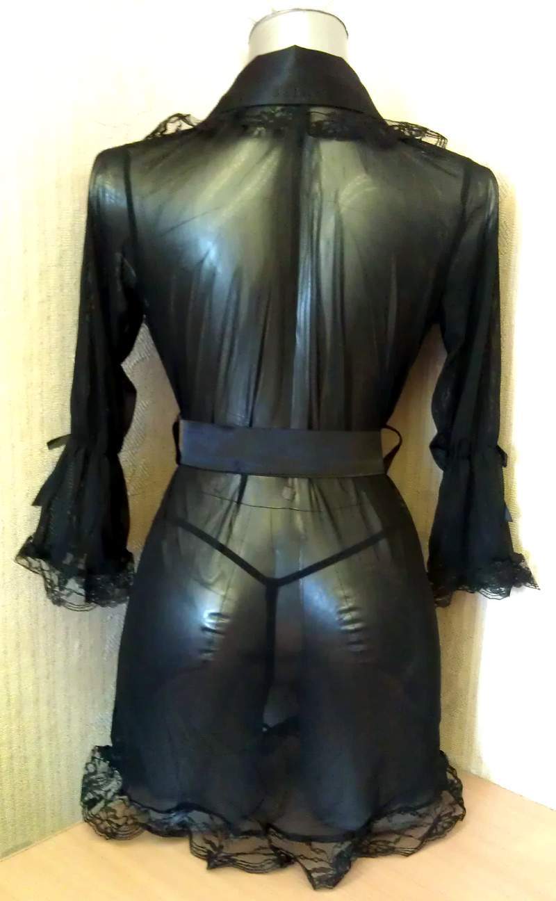 Черный пеньюар с полностью закрытыми плечами и сборкой на рукавах.