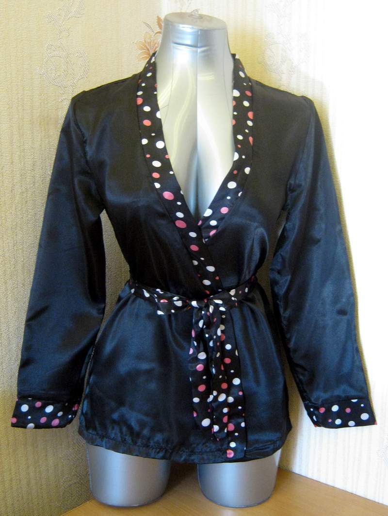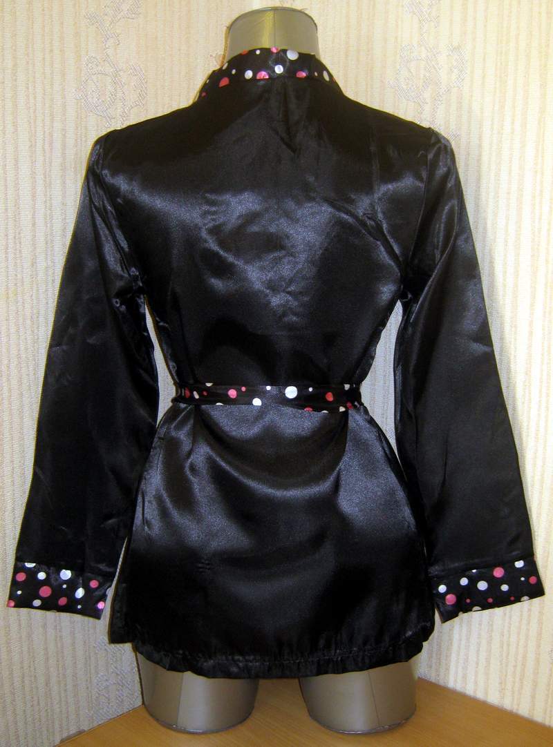 Черный пеньюар, украшенный по краям контрастной каймой из разноцветных кружочков краям. В комплект входят трусики-стринги