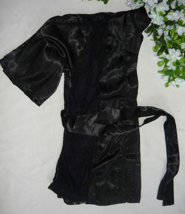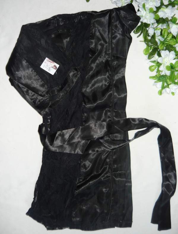 Роскошный пеньюар с шикарными кружевными вставками по бокам и на рукавах. Размер регулируется внутренними завязками и атласным поясом.
