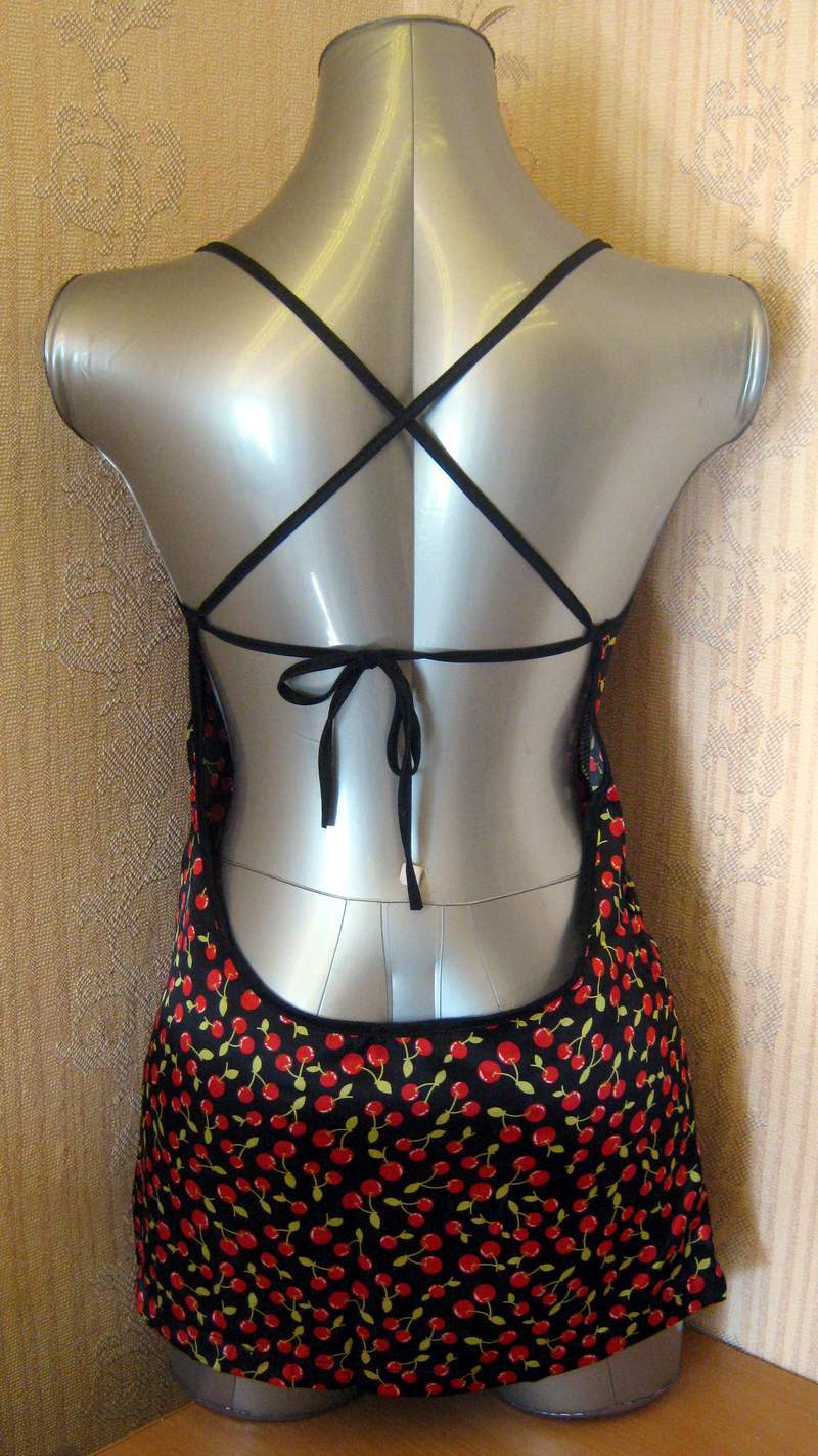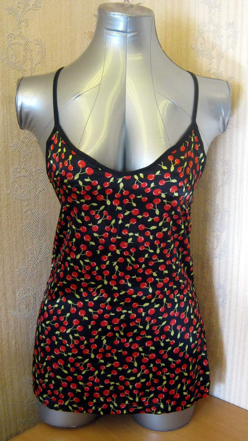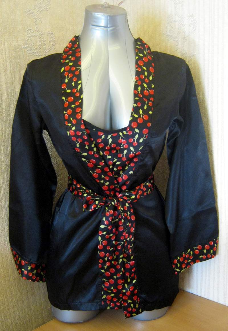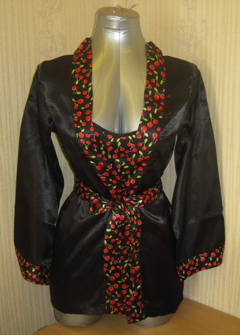 Пеньюар черного цвета, декорированный по краям рисунком из вишенок. В комплект также входит сорочка с ягодной расцветкой.