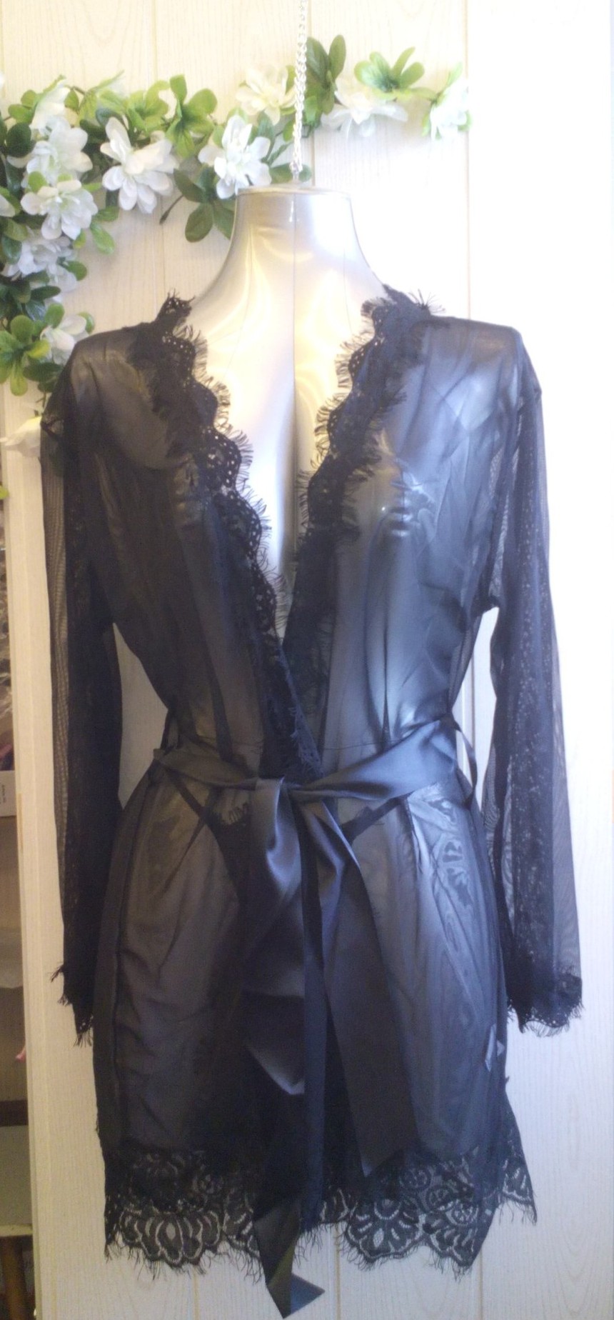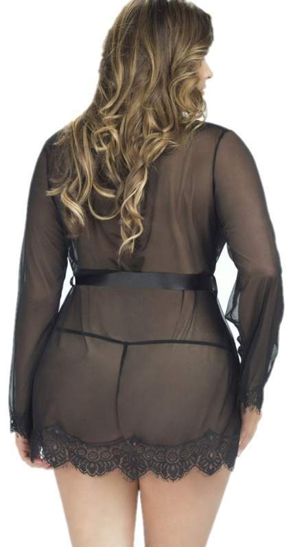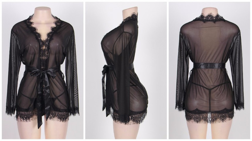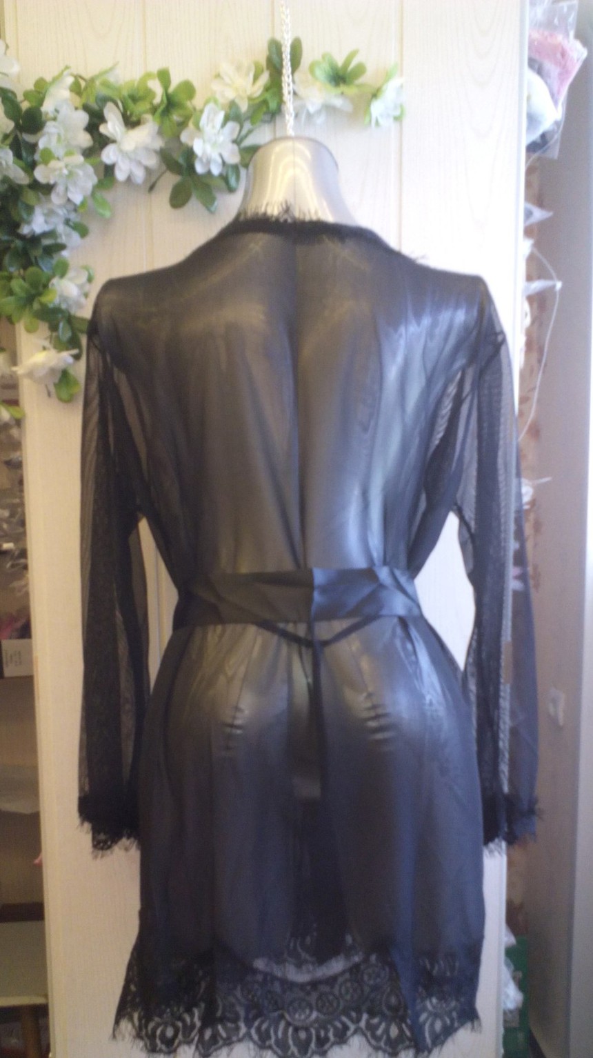 Пеньюар выполнен из полупрозрачной микросетки и украшен кружевом