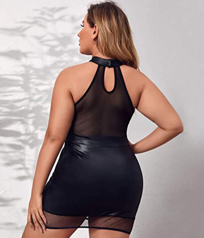 Данное платье выполнено из полиэстера - материала, имитирующего винил. Его особенность заключается в эластичности и обтягивании фигуры (у винила такой особенности нет).