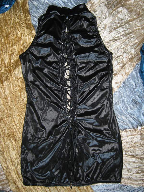 Пикантность платью придают симметричные вырезы со шнуровкой спереди и сзади