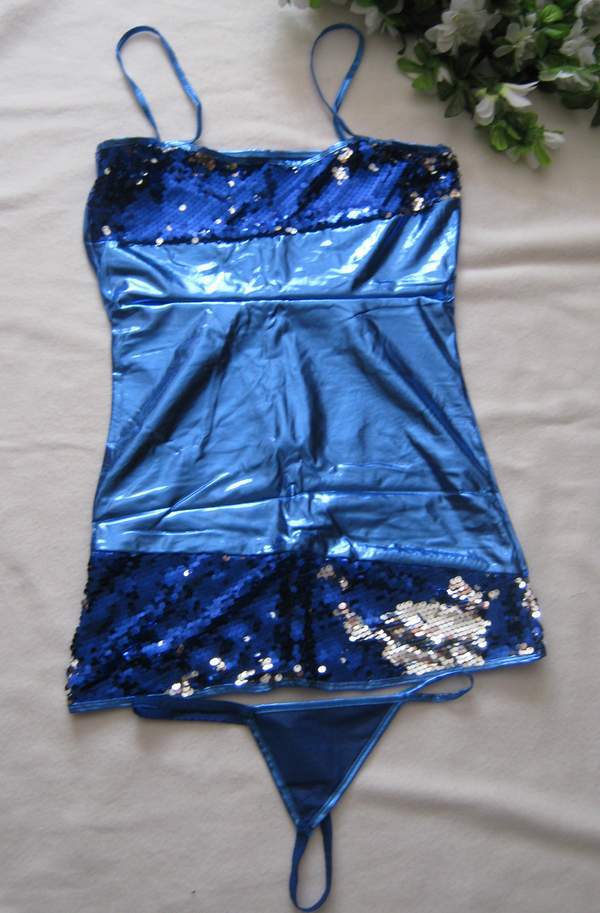 Короткое синее платье, выполненное из материала, имитирующего винил, плотно облегает фигуру, подчеркивая все достоинства. Платье декорировано пайетками, расположенными на лифе и по нижнему краю платья.
