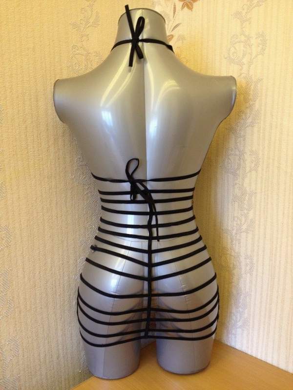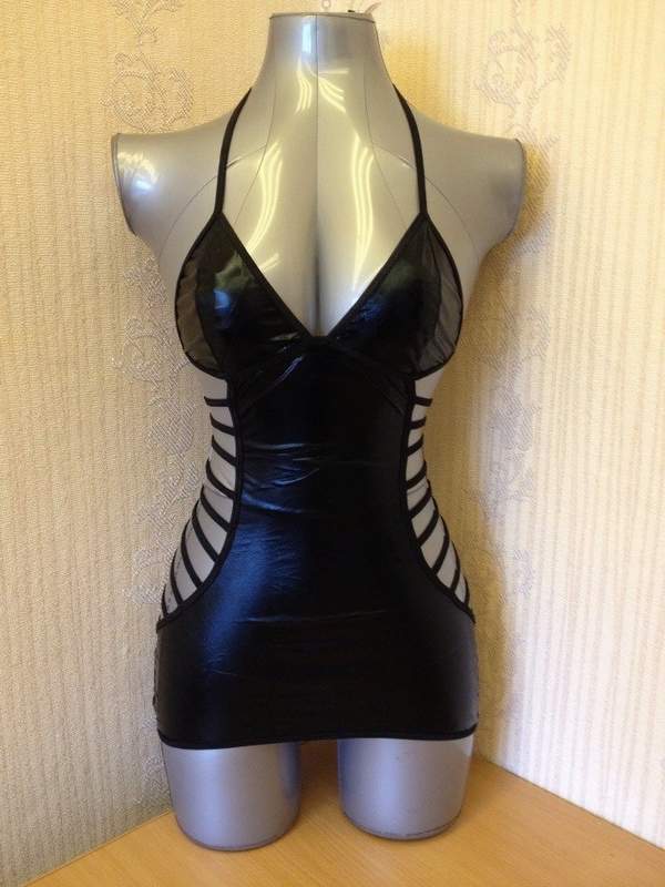 Соблазнительное платье завязывающееся на шее выполненно из полиэстера, имитирующего винил. Платье закрыто спереди и максимально открыто сзади. Смотрится очень эффектно!