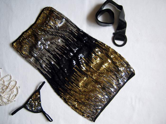 В комплект входят платье с серебрянными и золотыми пайетками, ремень и трусики-стринги