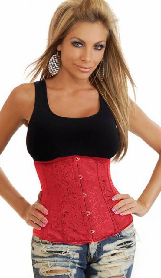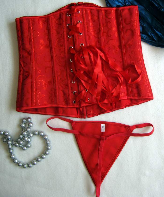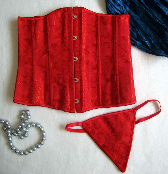 Подгрудный жаккардовый корсет. Спереди застежка стальной бюск, сзади шнуровка. Трусики-стринги в комплекте