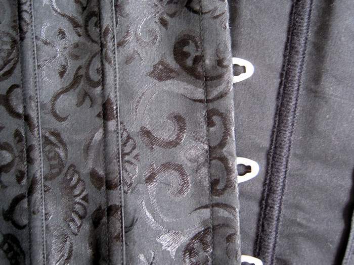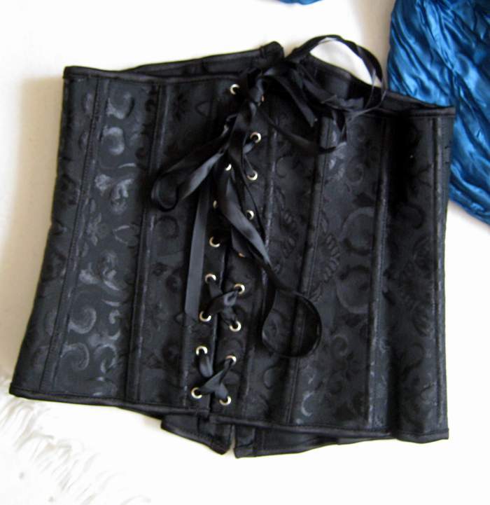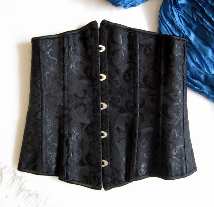 Подгрудный жаккардовый корсет. Спереди застежка стальной бюск, сзади шнуровка. Трусики-стринги в комплекте