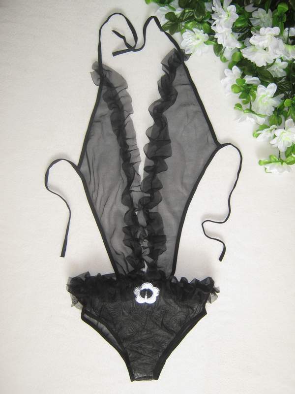 Полупрозрачное эротическое боди выполнено из тонкого сетчатого материала, украшено рюшами.