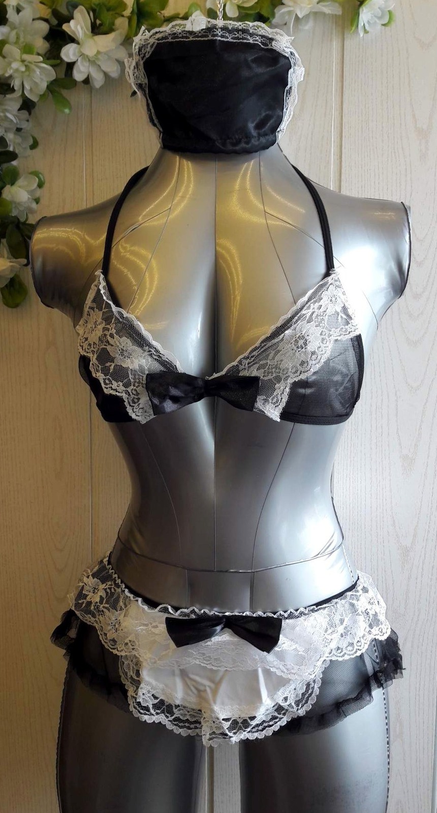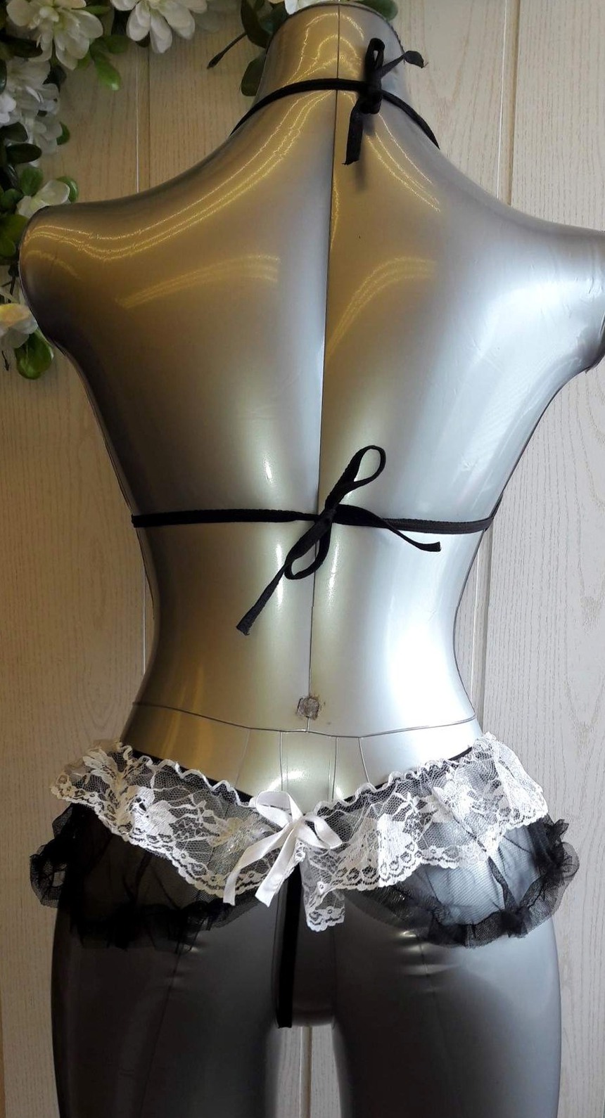 Костюм горничной выполнен из полупрозрачной микросетки и украшен атласными бантами и кружевом. Модель выпускается в одном размере XS-S. Лиф завязывается на спине и шее
