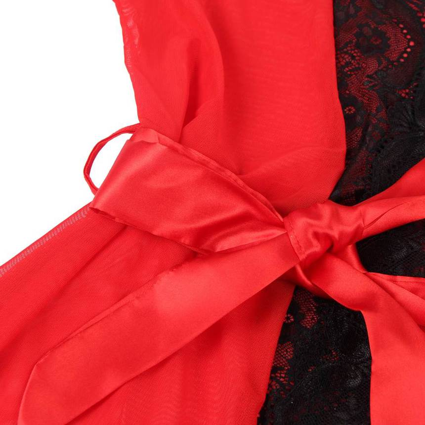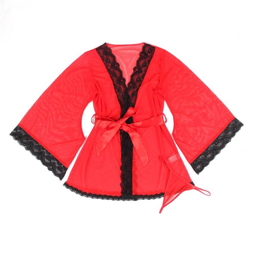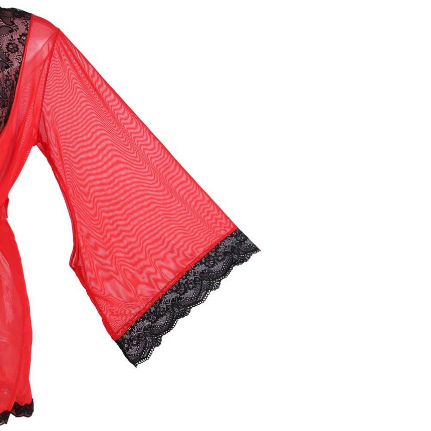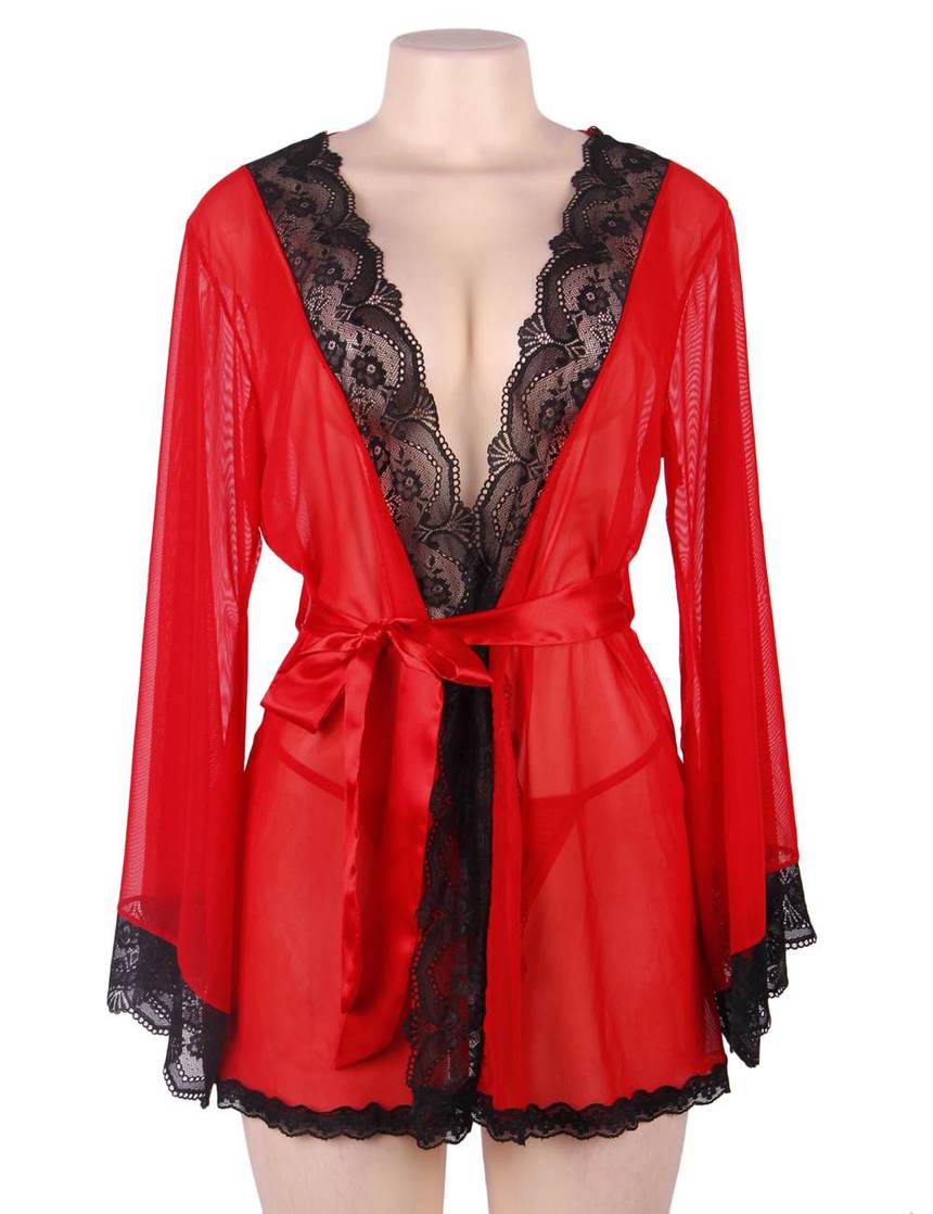 Женственный полупрозрачный красный пеньюар из сетчатой ткани с отделкой из черного кружева. В рукавах есть вырезы.