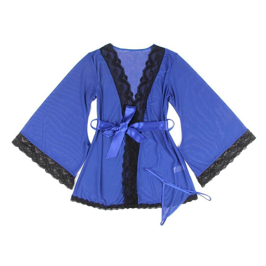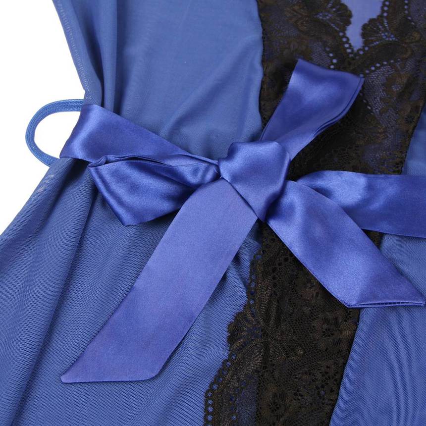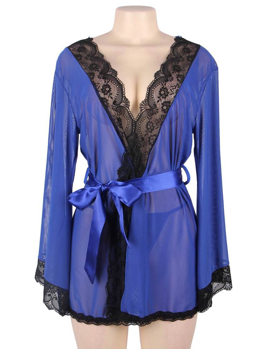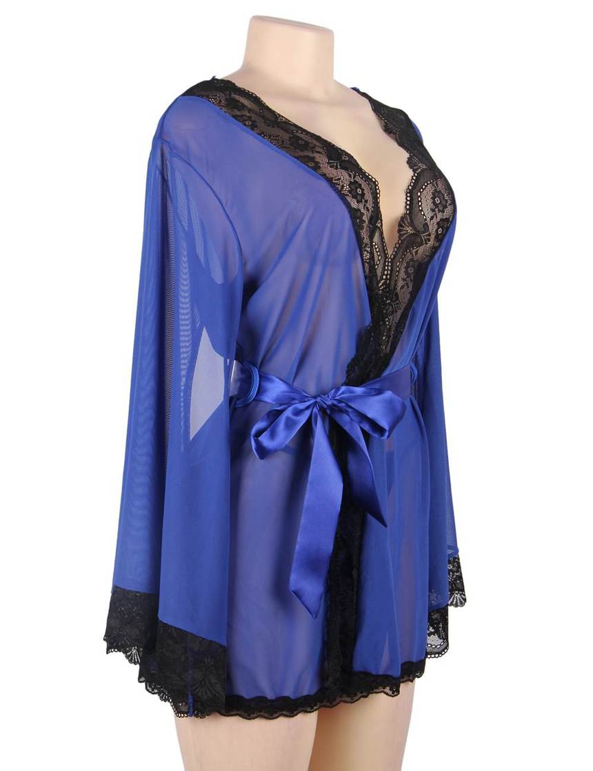 Женственный полупрозрачный синий пеньюар из сетчатой ткани с отделкой из черного кружева. В рукавах есть вырезы.