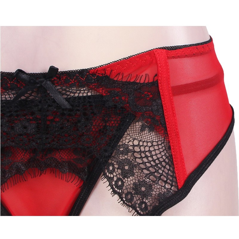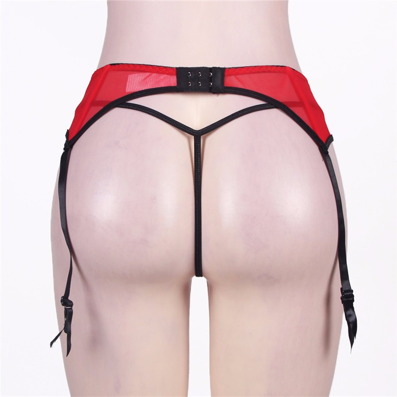 Пояс для чулок имеет 4 регулируемые по длине подвязки. Сзади бельевая застежка-крючки. В комплект входят трусики-стринги.