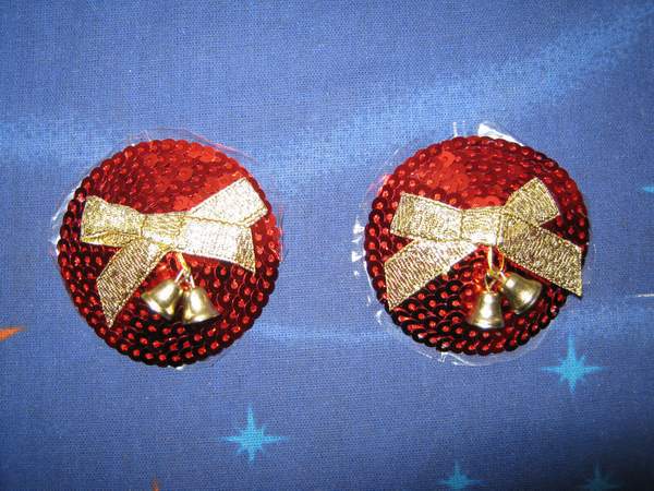 Яркие новогодний пэстис круглой формы, отделанные красными пайетками. Золотые бантики с бубенчиками игриво заиграют на вашей груди.