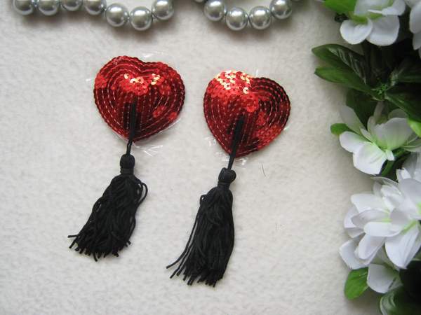 Заводные пэстис с кисточками будут игриво смотреться на груди. Пэстис расшиты красными пайетками.
