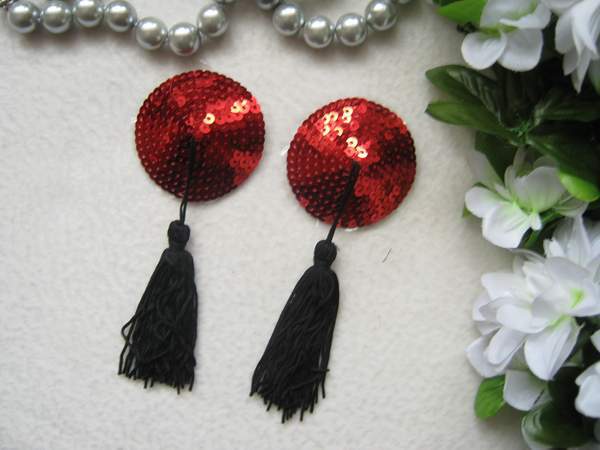 Блестящие пэстис круглой формы расшиты красным пайетками. Кисточки маняще заиграют на вашей груди.