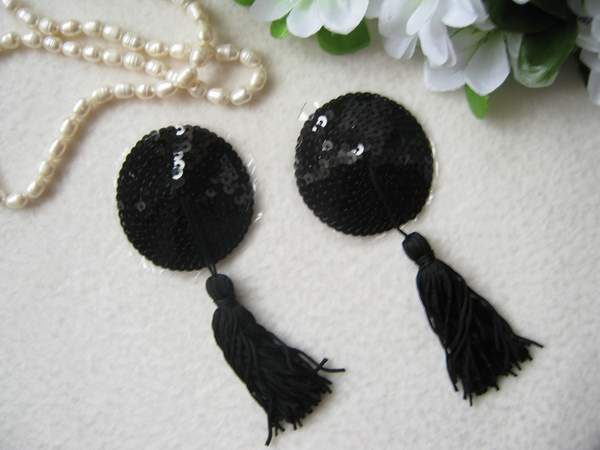 Блестящие пэстис круглой формы расшиты черными пайетками. Кисточки маняще заиграют на вашей груди.