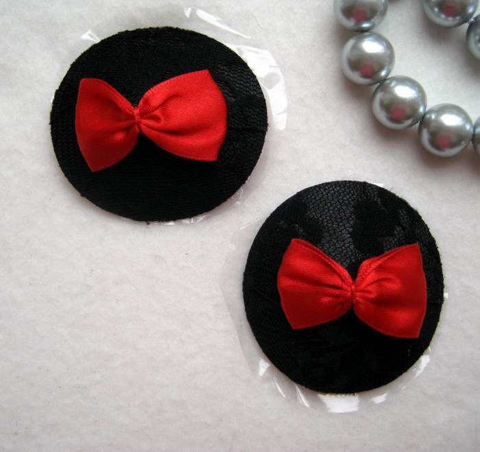 Очаровательные пэстис, украшенные тонким черным кружевом и маленькими красными атласными бантиками.