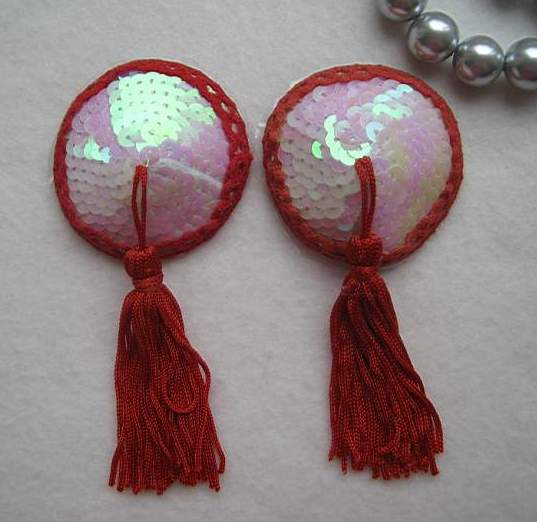 Соблазнительные пэстис круглой формы с красными кисточками. Поверхность украшена белыми пайетками с розовым отливом. Края отделаны красным кружевом. Идеальный аксессуар для игровых костюмов.