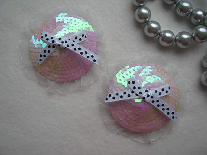 Романтичные пэстис круглой формы, отделанные белыми пайетками с розовым отливом. Романтичные бантики в горошек хорошо гармонируют с общим фоном пэстис, а нежное кружево по краю делают их еще нежнее. Отлично подходят к корсетам и игоровым костюмам.