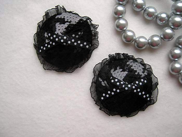 Романтичные пэстис круглой формы, отделанные черными пайетками, тонким кружевом и бантиками в белый горошек. Отлично подходят к корсетам и игоровым костюмам.