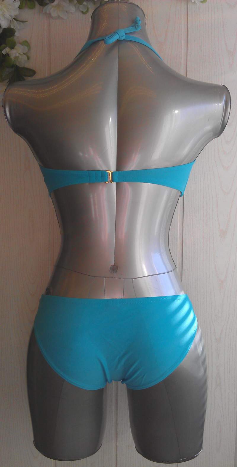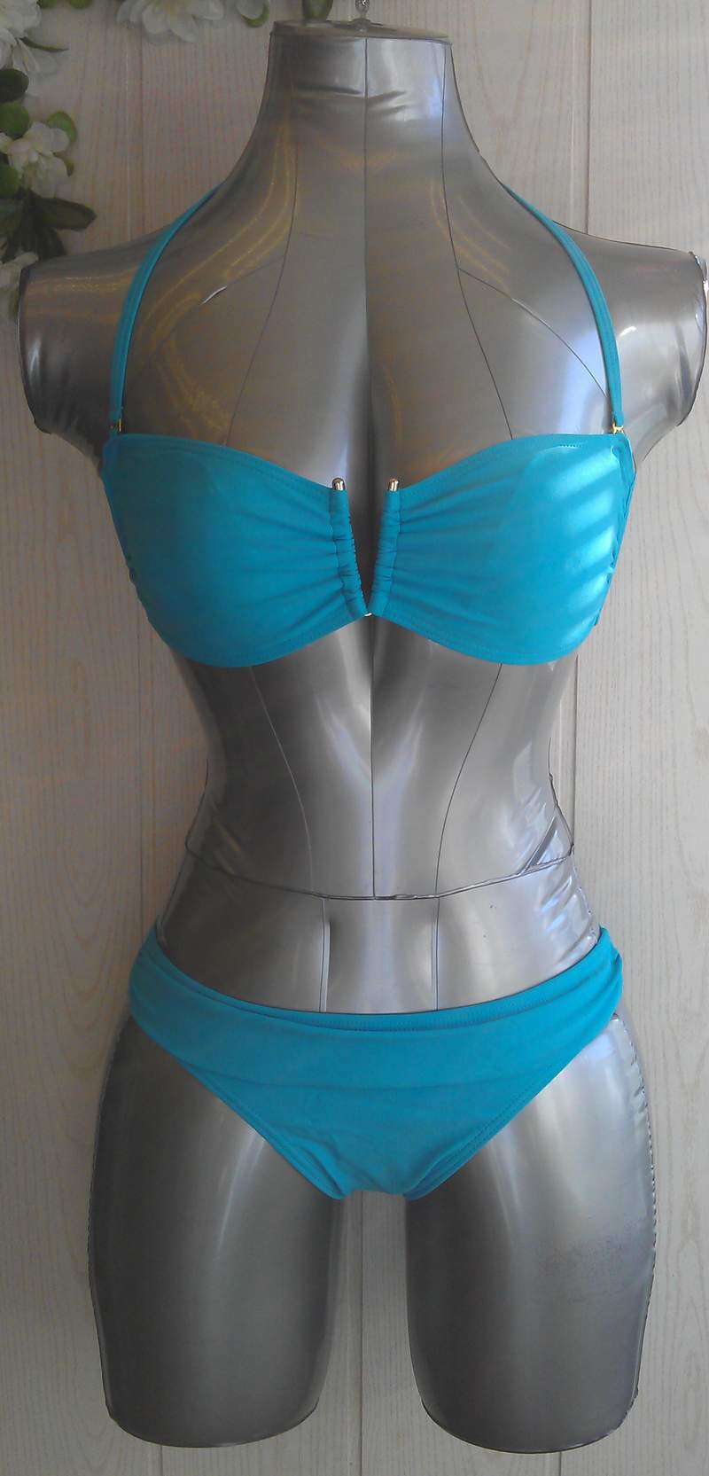 Стильный раздельный купальник голубого цвета с V-образной пряжкой на лифе. В комплекте съемная бретель.
