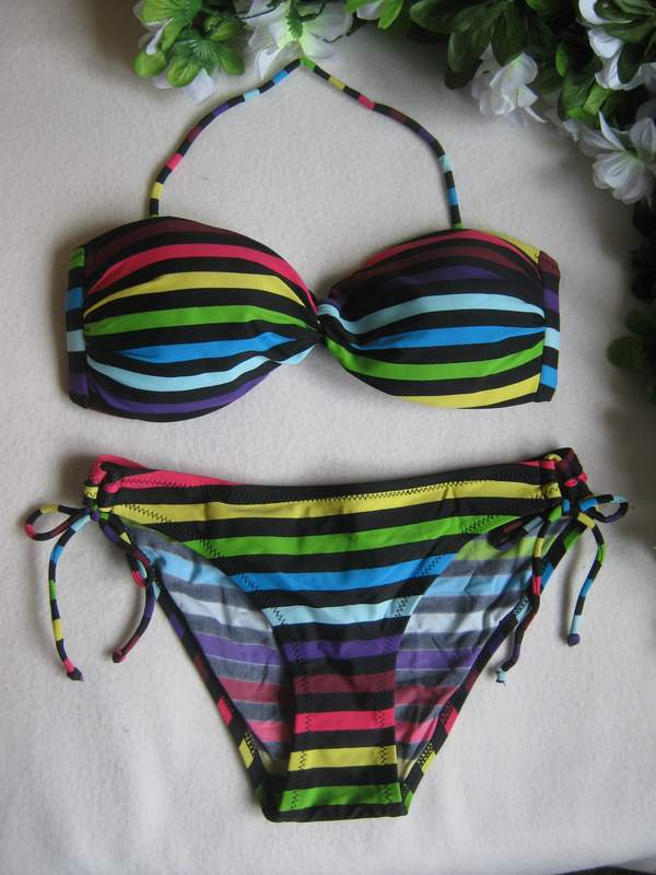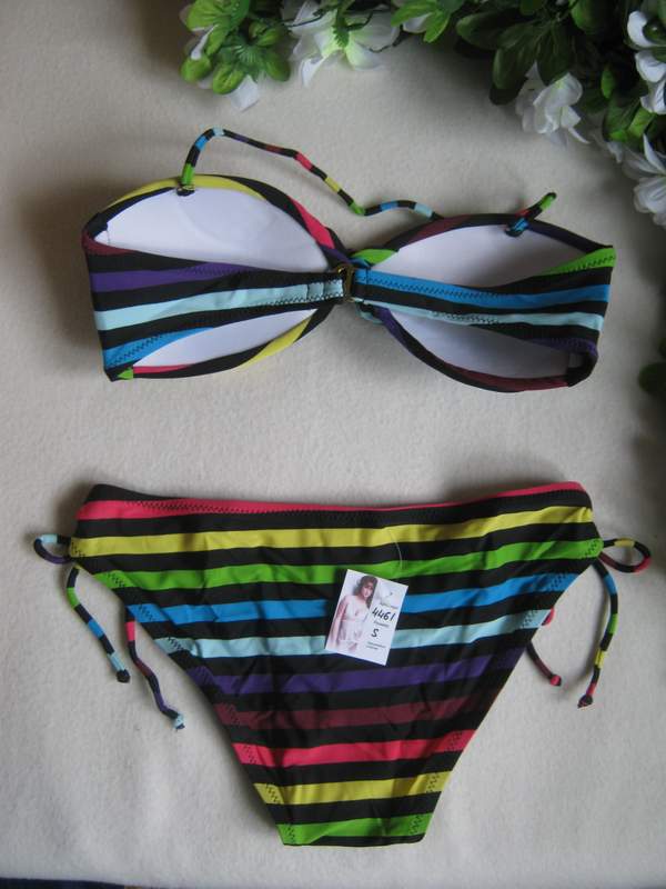 Яркий раздельный купальник с разноцвтными горизонтальными полосками. Лиф с поролоновыми вставками и съемной поддерживающей бретелью через шею. Трусики на завязках по бокам.